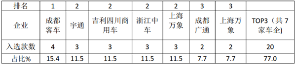 ---宇通客车、吉利四川商用车、浙江中车、上海万象4家车企均上榜3款,占比均为11.5%,并列位居第二;