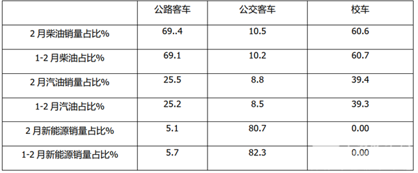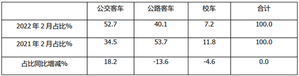 从上表可知,2022年2月5米以上客车三大细分市场占比呈现以下特点: