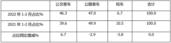 从上表可知,2022年1-2月5米以上客车三大细分市场占比呈现以下特点: