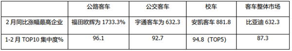 五、2022年2月当月各细分市场涨幅中,公路客车是福田,公交客车是宇通,校车是安凯,整体是比亚迪;2022年1-2月5米以上客车各细分市场top10市场集中度中,公路客车最高