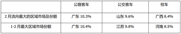 上表可见,从区域流向看,2022年2月5米以上客车市场三大细分市场中,公路客车流向广东区域最多(占据10.3%),主要由于2月份深圳、广州、佛山等珠三角地区采购的公路客车较多所致;而公交客车是流向山东区域较多(占据的份额为9.6%),2月份主要是青岛、烟台、济南等城市采购的新能源公交较多所致;而校车是流向广西最多。