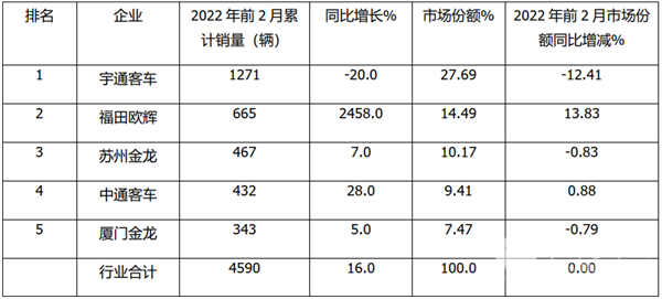根据中汽协数据,2022年前2月中型客车销量排行: