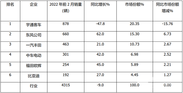 总体看,2022年前2月中型客车累计销量4315辆,同下降9%,宇通客车第一、东风汽车第二,一汽丰田第三;