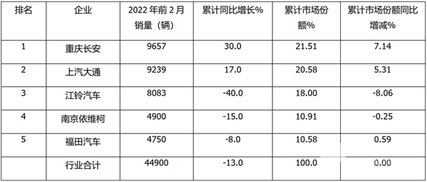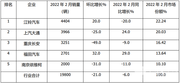 其余2家(第4-第5)销量均在3000辆以下。总体看,2022年2月,江铃位居榜首;大通居第二;长安位居第三; TOP5销量环比增3减,同比2增5降,其中福田汽车增幅最大。