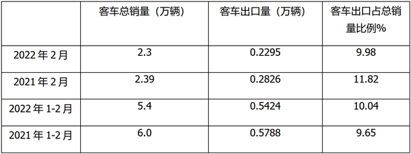上表可见,2022年2月客车出口占据客车总销量的比例为9.98%,同比2021年2月的11.82%下降了1.84个百分点;说明了2月的客车出口形势不太好,主要是由于春节、疫情及俄乌冲突等诸多因素的综合作用影响所致。