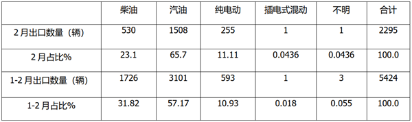 1、在今年2月,汽油客车出口1508辆,占比5.7%,为最大;其次是柴油客车出口530辆,占比23.1%;再次是纯电动客车出口255辆,占比11.11%;插电式混动客车只出口1辆,占比0.0436%,为最小;