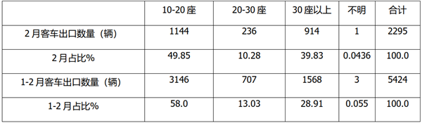 在今年2月按座位数量划分的客车出口结构中,10-20座(对应的主要是轻客)出口1144辆,占比近5成(49.85%),是出口占比最大的细分车型,而30座以上(主要对应大型、也有部分中型)客车是出口占比39.83%;20-30座(部分中型客车)出口占比最少(10.28%)。