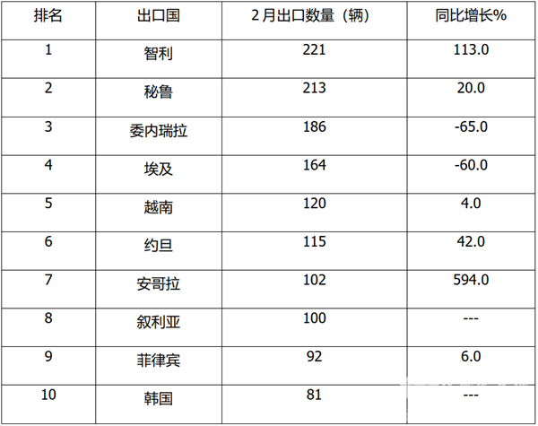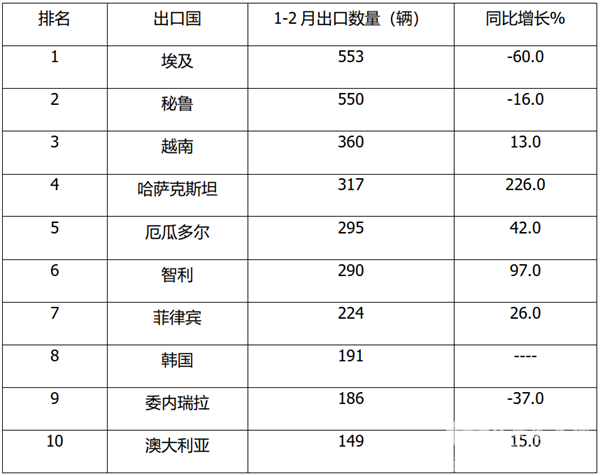 上表可见,今年2月我国客车出口最多的国家是智利;今年1-2月客车出口最多的国家是埃及。