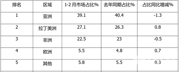 非洲作为中国援建以及一带一路的重点对象,之前几年出口增长较快。最近出现了小幅度下滑现象。目前主要依靠埃及、南非、阿尔及利亚、尼日利亚等国家。今年前2月出口市场占比为22.5%,同比下降0.5个百分点;