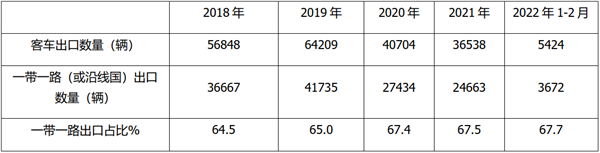 上表显示,在近5年中,我国客车出口一带一路区域占据客车出口市场的权重在逐年上升,从2018年的64.5%逐年升高到今年前2月的67.5%。说明“一带一路”国(或地区)是我国当前客车出口的主力市场。