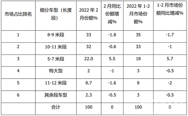 上表可见,在2022年2月及1-2月新能源公交客车各长度段(细分车型)销量占比中,呈现以下特点: