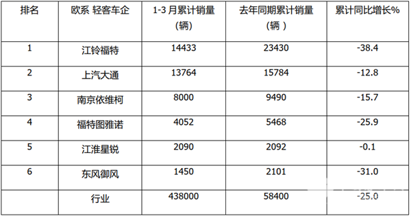 总体看,今年一季度主流欧系轻客TOP6车企中,市场份额同比3增(大通、南京依维柯、江淮星锐)3减(江铃、福田和东风御风)。