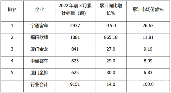 上表可见,在2022年前3月中型客车累计销量top5中: