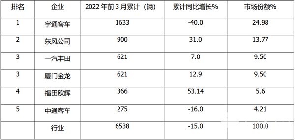 根据中汽协数据,2022年前3月中型客车销量排行: