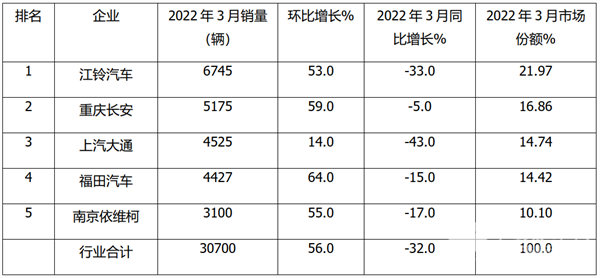 总体看,2022年3月,江铃位居榜首;长安居第二;大通位居第三; TOP5销量环比全部增长,其中福田环比增速最大;同比全部下降,其中长安汽车降幅最小。