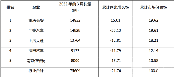 根据中汽协数据,2022年前3月轻型客车累计销售7.56万辆,同比下滑22%,2022年前3月TOP5企业轻型客车销量、同比及份额统计:
