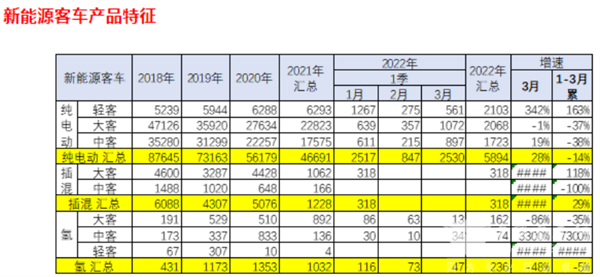 根据中国汽车流通协会数据,2022年3月新能源客车销售2577辆,其中纯电动销售2530辆,燃料电池销售47辆;1-3月新能源客车累计销售6448辆,其中纯电动累计销售5894辆,插电式混动销售318辆,燃料电池销售236辆(见截图2,数据来源中国汽车流通协会上牌信息)