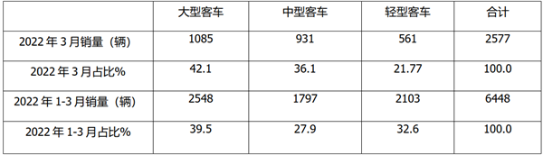 前3月大型客车占比39.5%,居第一;中型客车占比27.9%,居第三;轻型客车占比32.6%,居第二。