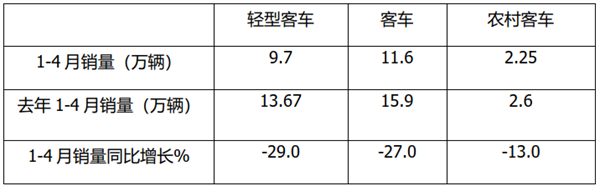 上表显示,今年1-4月农村客车销售2.25万辆,同比增长-13%,虽然受到疫情影响,当前农村客车销量也出现了一定程度的下滑,