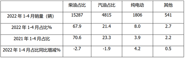 上表可见,2022年1-4月与2021年同期比较,农村客运车型柴油动力销量15287辆,占比67.9%,其占比同比减少2.7个百分点,主要是很多山区的农村道路复杂,柴油爬坡“更有劲”且经济。