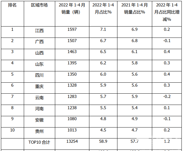 三、2022年1-4月,农村客车销量区域流向TOP10 中江西占比最大,占比同比增加最多
