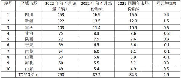 特点三、从区域流向看,2022年前4月国六天然气客车销量主要扎堆在天然气资源比较丰富、加气站网点比较多的西北和西南区域,其中四川占比最高,且同比增加最多,TOP10累计占比超近9成,且同比增加2.9个百分点,市场集中度进一步提高