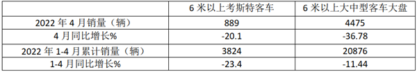 根据终端上牌及客车统计信息网数据,2022年4月及1-4月6米(含,下同)以上考斯特客车销量、同比与大中型客车大盘比较: