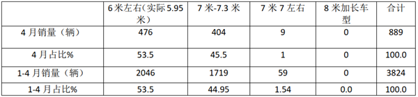 根据上牌信息,2022年4月及1-4月考斯特客车按长度段车型划分销量结构: