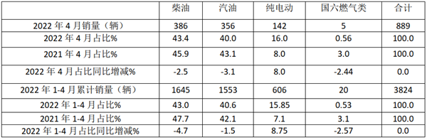 根据终端上牌数据统计,按燃料种类划分,2022年4月及1-4月考斯特客车销量结构: