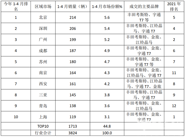 另外,丰田考斯特、宇通T7、晶马、金旅等是2022年1-4月考斯特客车在重点区域销售较好的几个主要品牌。