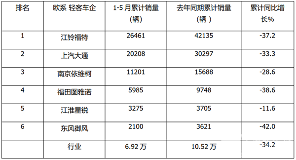 总体看,今年前5月欧系轻客主流车企top6中,累计销量同比全部下降,这是近年来非常罕见的现象。