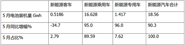 上表可见,在2022年5月,新能源客车动力电池装机量同比下降34.7%,是新能源汽车市场中唯一负增长的细分车型(新能源专用车,同比增幅96%;新能乘用车增幅95%),是新能源汽车中最“不给力”的细分市场;占比为2.79%,在新能源汽车市场中占比最小(第一是新能能源乘用车,占比87.48%)。