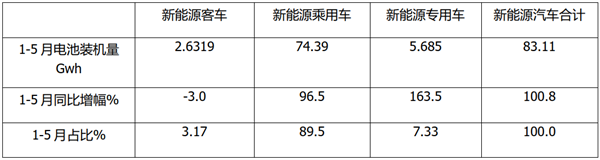 特点一、5月我国新能客车动力电池装机量在新能源汽车各细分市场中同比增幅最小,是新能源汽车中同比唯一下降的细分市场