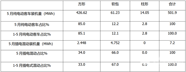 纯电动客车中,无论是5月还是1-5月,方形电池装机量都是最大,占比达到85%左右;其次是软包型占比12%左右,最小的是柱形占比不到3%。