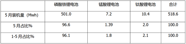 上表可见,在2022年5月及1-5月新能源新能源客车装机量中,磷酸铁锂电池占比分别为96.6%和96.1%,均占据绝对主体地位,其次是锰酸占比分别1.39%和1.8%,再次是钛酸锂占比分别为2.0%和2.1%(主要是格力钛新能源客车装机)。