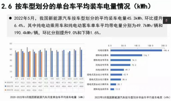 根据中国汽车动力电池产业创新联盟数据,2022年5月我国新能源汽车按车型划分,单车平均装车电量为45.3kwh,环比提升6.4%,其中纯电动客车单车平均装电量为190.4kwh,环比下降1.6%,具体各车型单车平均装车电量统计如下: