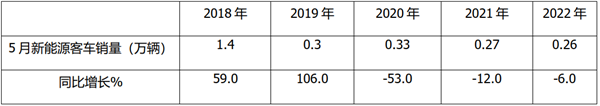 2022年5月新能源客车终端上牌销量为0.26万辆,在近5年同期中处于最低,说明今年5月的新能源客车终端实际销量处于极度低迷状态;5月销量同比下降6%,降幅在近5年同期中居第三。