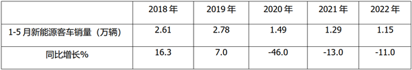上表可见,2022前5月新能源客车终端上牌累计销量为1.15万辆,比去年同期还少0.24万辆,在近5年同期中处于最低,同比下降11%,降幅在近年同期中居于第三,可以认为今年前5月新能源客车终端市场是近年相对差、处于近年同期低迷的年份,据调研分析具体原因有: