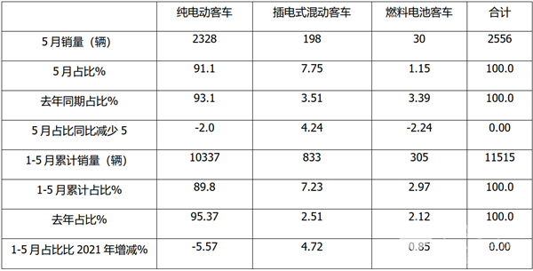 2022年5月及1-5月按技术路线划分,新能源客车销量结构(数据来源:上牌信息):