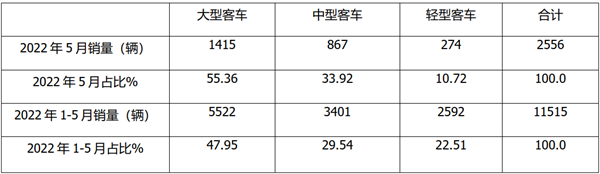 前5月大型客车占比47.95%,居第一;中型客车占比29.54%,居第三;轻型客车占比22.51%,居第二。