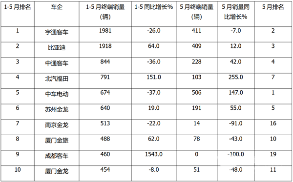 1、在今年1-5月新能源客车终端市场累计销量中,