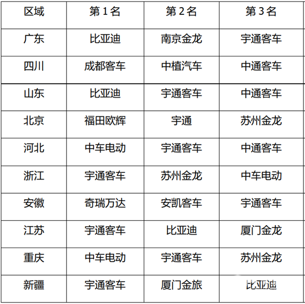 一是属地品牌有一定的地利优势,比如成都地区的中成都客车、中植汽车都是本地品牌占据第一和第二。北京第一名是被属地品牌福田欧辉占据。二是宇通、比亚迪、中车电动等品牌覆盖的市场面相对较广。比如在上表的前10个城市中,居在第一位的,宇通占据了3个(浙江、江苏和新疆),比亚迪也占据了2个(广东和山东)、中车占据2个(河北与重庆)。