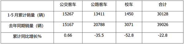 一、5月5米以上公路、公交、校车三大细分市场中,同比全面下降,其中校车降幅近7成