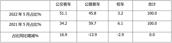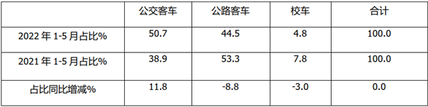 从上表可知,2022年1-5月5米以上客车三大细分市场占比呈现以下特点: