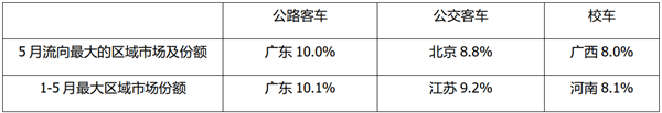 2022年1-5月公路、公交、校车则分别流向最多的是广东(10.1%)、江苏(9.2%)和河南(8.1%)。
