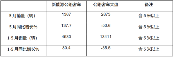 根据慧眼看车数据,2022年5月及1-5月新能源公路客车销量同比与公路客车大盘比较: