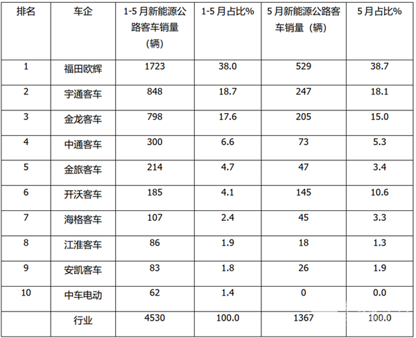 可见,无论是在今年5月还是1-5月的新能源公路客车市场中,福田欧辉均一骑绝尘,宇通和金龙分别居第二、第三。