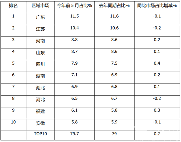 根据终端上牌信息,今年前5月5米以上公路客车TOP10区域市场占比统计:
