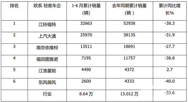 总体看,今年上半年欧系轻客主流车企top6中,累计销量同比5降1增,整体市场仍然不尽人意。