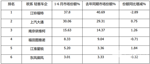 总体看,今年上半年主流欧系轻客TOP6车企中,市场份额同比3增(大通、南京依维柯、江淮星锐)3减(江铃、福田和东风御风),其中江淮星锐份额增加最多,江铃汽车份额同比减少最多。